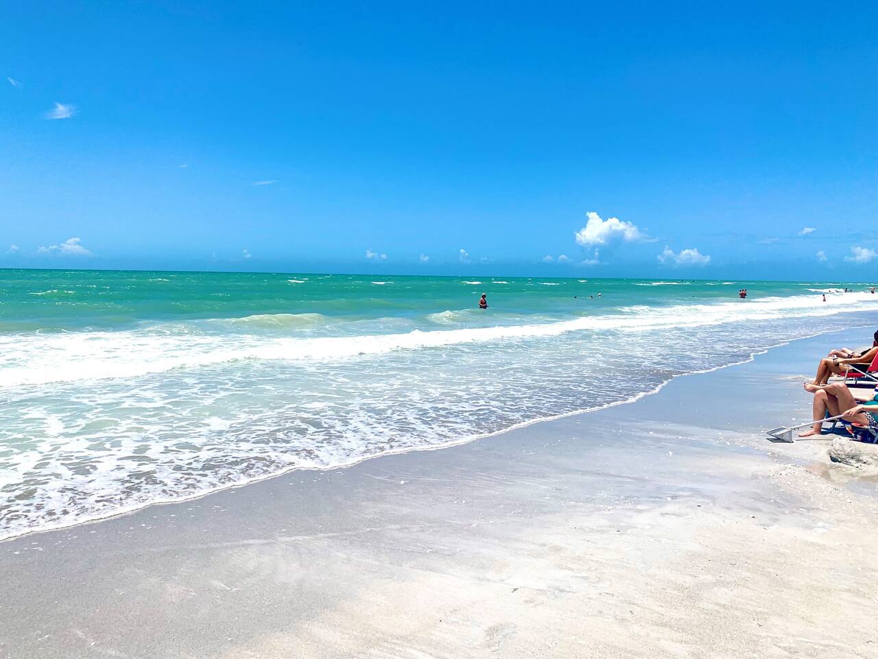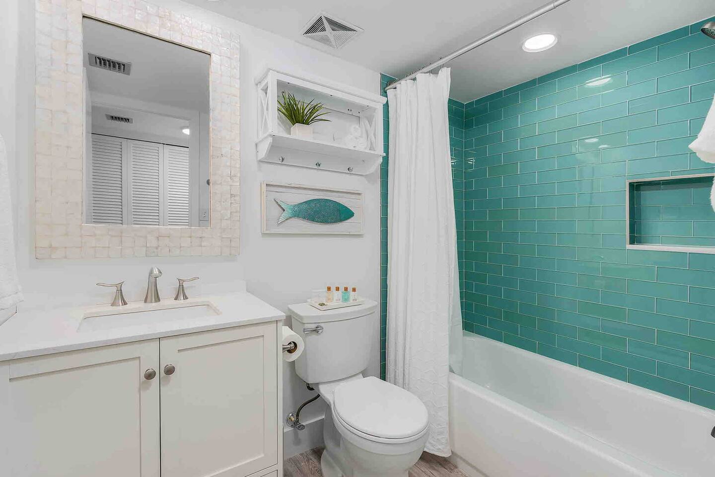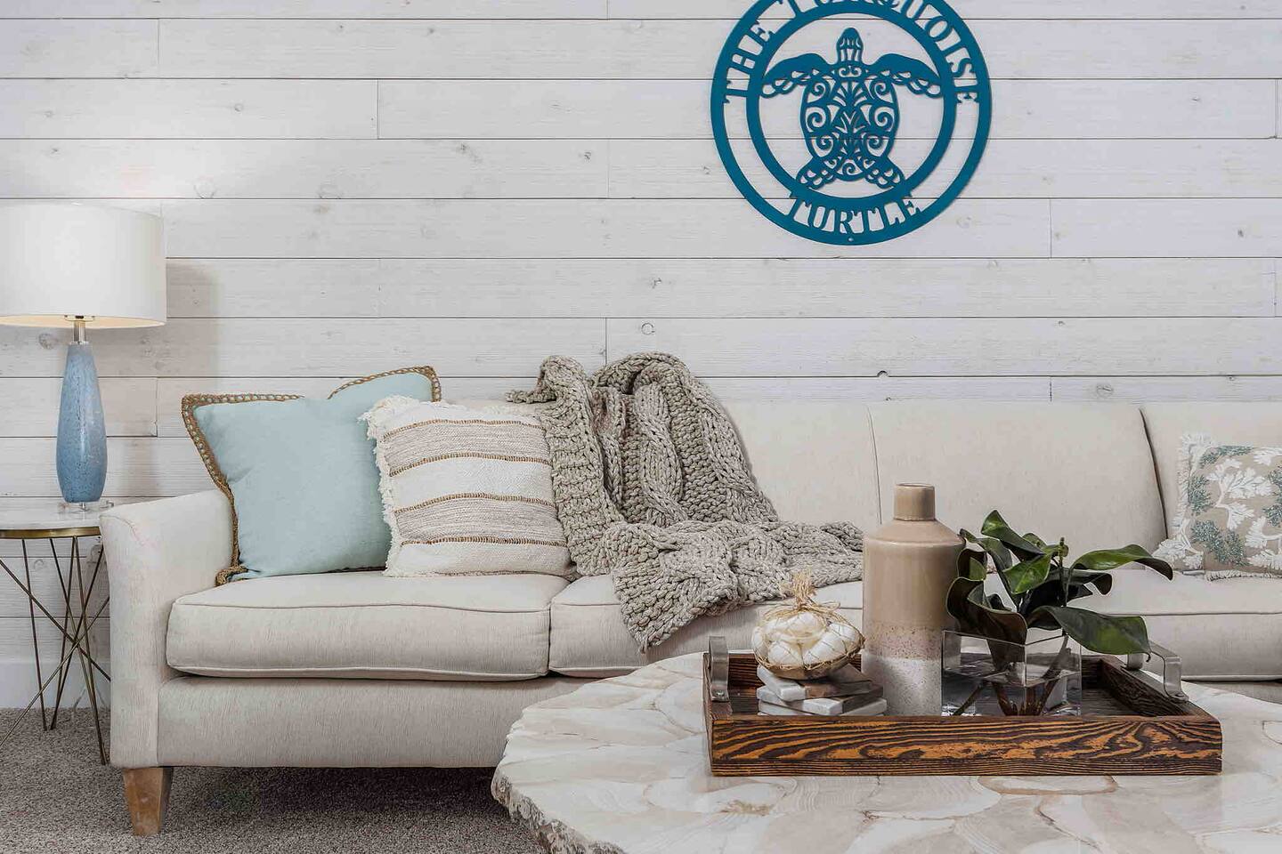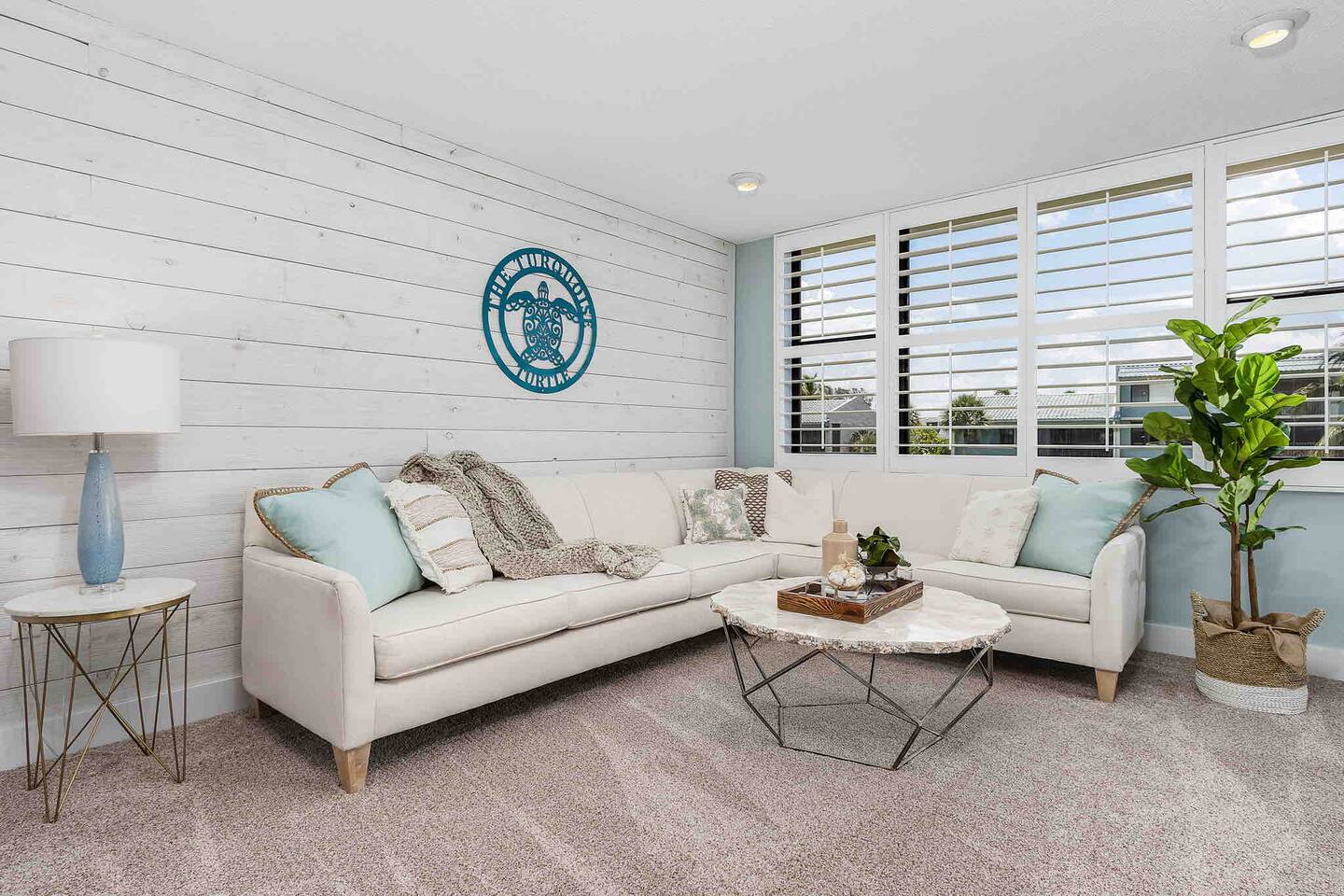 The Turquoise Turtle is a third floor, gulf view condo that overlooks one of the largest pools on the island. The unit was impeccably updated in 2021; all appliances, furniture, linens/towels, and decor are new. The bathrooms have been completely redone with gorgeous glass and porcelain tile, quartz vanities and new mirrors. No expense was spared making The Turquoise Turtle the premier unit within Loggerhead Cay. **Kitchen** In addition to the brand new stainless steel appliances, The Turquoise Turtle is stocked with restaurant quality tools, pots, pans, glassware, and flatware. You will have everything to make memorable meals with your family. Brand new quartz countertops and glass tile backsplash create a bright and beachy feel. The condo includes a dining table that comfortably seats six and features a gorgeous white capiz shell chandelier. **Living Room** Beyond the stunning view of the Gulf, the living space in The Turquoise Turtle features a custom white shiplap wall, plantation shutters, handpicked artwork, a chic sectional, and 60" smart TV with basic cable, all connected to gigabit fiber optic wifi. Connect all your devices for fast streaming. The centerpiece of the room is our unique fossilized clamshell coffee table. **Master Bedroom & Bathroom** Enjoy the fantastic king bed, with our favorite hybrid mattress, and hotel quality bedding. A smart TV and full size dresser accompany the two closets in the room, with ample space for all of your clothes, whether staying for a week or a month! The bathroom is completely new with a vanity and shelving for your toiletries as well as a stunning turquoise glass shower/tub surround adorning the soaking tub. **Second Bedroom & Bathroom** The second bedroom features twin bunk beds and a City Furniture queen bed as well as a flatscreen tv. All mattresses are the exact same quality as the King in the master. The second bathroom can be accessed from the hallway, next to the bedroom and features a vibrant tile feature wall as well as stylish white tile walls and tile shower floor. The vanity is a large 48" that provides ample space whether used by just one person, or four sharing the room to store their items. **Lanai** Relax, sip your favorite drink, and listen to the surf on our outdoor patio featuring comfortable woven wood furniture. Behind the decorative privacy screen you will find a beach cart, beach toys for the kiddos including puddle jumpers for the little ones, rolling cooler, beach umbrella, and beach chairs.