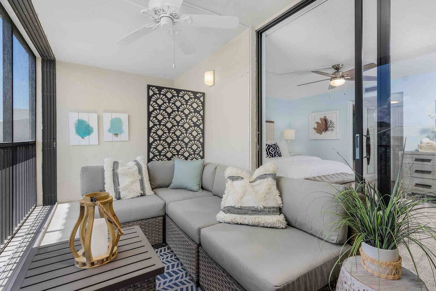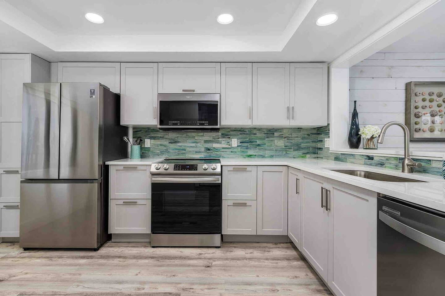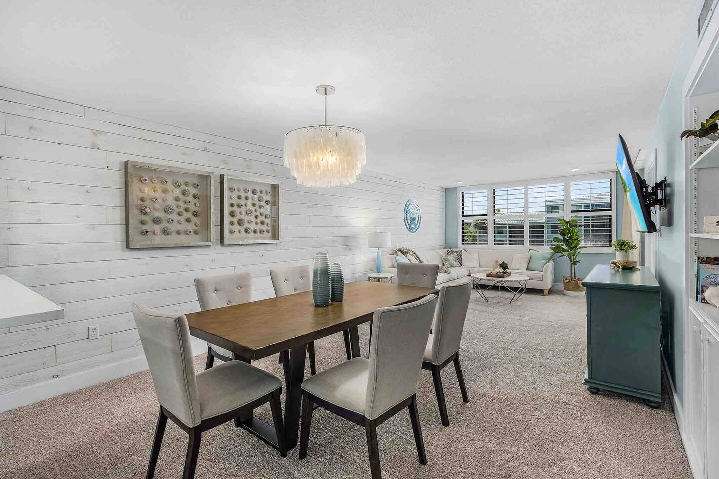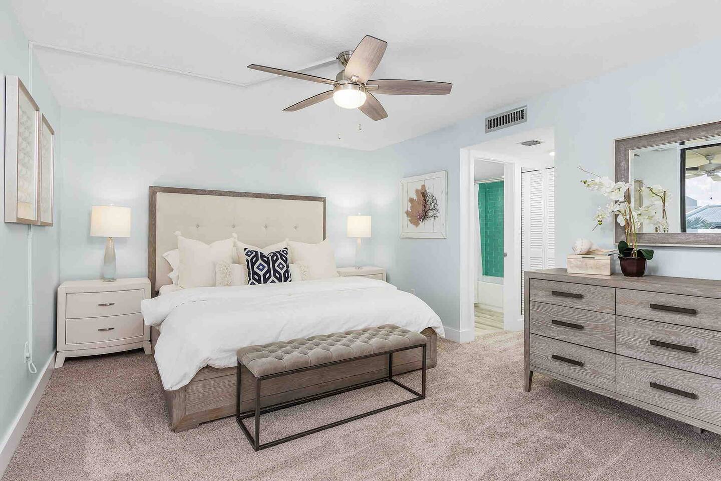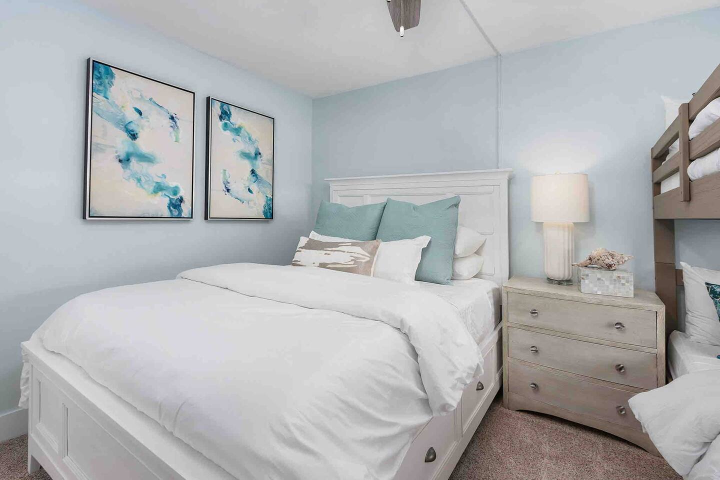 The Turquoise Turtle is a third floor, gulf view condo that overlooks one of the largest pools on the island. The unit was impeccably updated in 2021; all appliances, furniture, linens/towels, and decor are new. The bathrooms have been completely redone with gorgeous glass and porcelain tile, quartz vanities and new mirrors. No expense was spared making The Turquoise Turtle the premier unit within Loggerhead Cay. **Kitchen** In addition to the brand new stainless steel appliances, The Turquoise Turtle is stocked with restaurant quality tools, pots, pans, glassware, and flatware. You will have everything to make memorable meals with your family. Brand new quartz countertops and glass tile backsplash create a bright and beachy feel. The condo includes a dining table that comfortably seats six and features a gorgeous white capiz shell chandelier. **Living Room** Beyond the stunning view of the Gulf, the living space in The Turquoise Turtle features a custom white shiplap wall, plantation shutters, handpicked artwork, a chic sectional, and 60" smart TV with basic cable, all connected to gigabit fiber optic wifi. Connect all your devices for fast streaming. The centerpiece of the room is our unique fossilized clamshell coffee table. **Master Bedroom & Bathroom** Enjoy the fantastic king bed, with our favorite hybrid mattress, and hotel quality bedding. A smart TV and full size dresser accompany the two closets in the room, with ample space for all of your clothes, whether staying for a week or a month! The bathroom is completely new with a vanity and shelving for your toiletries as well as a stunning turquoise glass shower/tub surround adorning the soaking tub. **Second Bedroom & Bathroom** The second bedroom features twin bunk beds and a City Furniture queen bed as well as a flatscreen tv. All mattresses are the exact same quality as the King in the master. The second bathroom can be accessed from the hallway, next to the bedroom and features a vibrant tile feature wall as well as stylish white tile walls and tile shower floor. The vanity is a large 48" that provides ample space whether used by just one person, or four sharing the room to store their items. **Lanai** Relax, sip your favorite drink, and listen to the surf on our outdoor patio featuring comfortable woven wood furniture. Behind the decorative privacy screen you will find a beach cart, beach toys for the kiddos including puddle jumpers for the little ones, rolling cooler, beach umbrella, and beach chairs.
