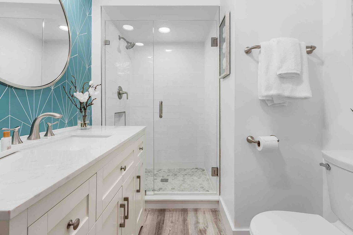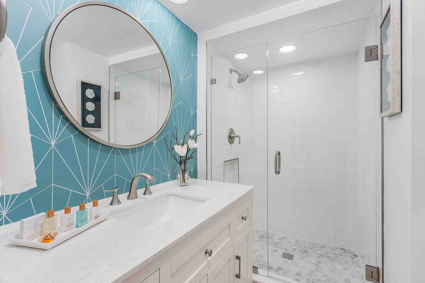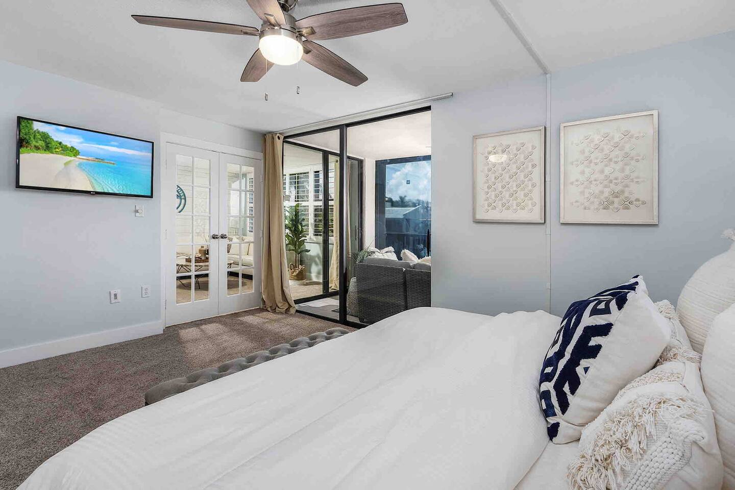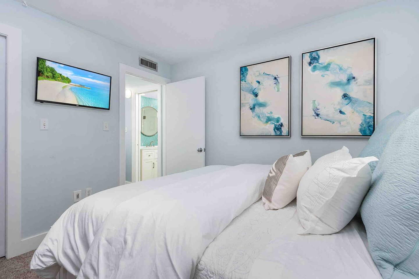 The Turquoise Turtle is a third floor, gulf view condo that overlooks one of the largest pools on the island. The unit was impeccably updated in 2021; all appliances, furniture, linens/towels, and decor are new. The bathrooms have been completely redone with gorgeous glass and porcelain tile, quartz vanities and new mirrors. No expense was spared making The Turquoise Turtle the premier unit within Loggerhead Cay. **Kitchen** In addition to the brand new stainless steel appliances, The Turquoise Turtle is stocked with restaurant quality tools, pots, pans, glassware, and flatware. You will have everything to make memorable meals with your family. Brand new quartz countertops and glass tile backsplash create a bright and beachy feel. The condo includes a dining table that comfortably seats six and features a gorgeous white capiz shell chandelier. **Living Room** Beyond the stunning view of the Gulf, the living space in The Turquoise Turtle features a custom white shiplap wall, plantation shutters, handpicked artwork, a chic sectional, and 60" smart TV with basic cable, all connected to gigabit fiber optic wifi. Connect all your devices for fast streaming. The centerpiece of the room is our unique fossilized clamshell coffee table. **Master Bedroom & Bathroom** Enjoy the fantastic king bed, with our favorite hybrid mattress, and hotel quality bedding. A smart TV and full size dresser accompany the two closets in the room, with ample space for all of your clothes, whether staying for a week or a month! The bathroom is completely new with a vanity and shelving for your toiletries as well as a stunning turquoise glass shower/tub surround adorning the soaking tub. **Second Bedroom & Bathroom** The second bedroom features twin bunk beds and a City Furniture queen bed as well as a flatscreen tv. All mattresses are the exact same quality as the King in the master. The second bathroom can be accessed from the hallway, next to the bedroom and features a vibrant tile feature wall as well as stylish white tile walls and tile shower floor. The vanity is a large 48" that provides ample space whether used by just one person, or four sharing the room to store their items. **Lanai** Relax, sip your favorite drink, and listen to the surf on our outdoor patio featuring comfortable woven wood furniture. Behind the decorative privacy screen you will find a beach cart, beach toys for the kiddos including puddle jumpers for the little ones, rolling cooler, beach umbrella, and beach chairs.